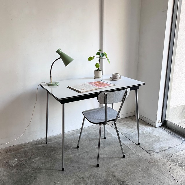 クロームのパイプフレームがモダンな フォーマイカ天板のキッチンテーブル。 1960年代頃からベルギーTAVO社をはじめとして、 フランスやドイツ、オランダ等でも同様のデザインが数多く生産、販売されました。 アパルトマン等の小さなキッチンでの使用を想定しているため 圧迫感を感じさせないミニマルな佇まい。 天板は80㎝×50㎝とコンパクトなサイズ感で圧迫感がなく 構造もシンプルでしっかりとしています。 天板表面は水も弾く丈夫なメラミン素材で、 レトロなボーダー柄が軽快で可愛らしい印象です。 デスクや作業台としてはもちろん、 よりコンパクトなダイニングテーブルを探していた方にぜひおすすめです。 ※表示価格はテーブルのみのお値段です。 Condition / 1960-70年代ごろのヴィンテージ品になります。 天板には経年使用による線キズや擦れ、部分的な打痕やコバの欠け等ございます。 メタルレッグには経年使用による若干の歪み、キズや部分的な錆等ございます。 詳細は画像をご確認ください。 商品の撮影環境の影響やご覧頂くモニター環境などで、画面の色が実際の色と異なっている場合がございます。詳細なコンディションはお気軽にお問い合わせください。 Country / オランダ Size(㎜) / W:800 D:500 H:745 Detail / フォーマイカ天板(メラミン素材) クロームパイプフレーム 脚部取り外し可能 Delivery / 別途送料が掛かります。 東京より、家財おまかせ便 Cランクで発送致します。 (脚部はそのままの状態でのお届けとなります。取り外して発送ご希望の方は、配送料が変わるためご購入前にお気軽にご相談ください。) Attention / サイズの大きな商品の場合、必ずご購入前に搬入経路をご確認下さい。 【 ご購入前に必ずお読みください 】 お支払い後の変更やキャンセルは承れませんので、 下記ご希望の方はご購入前にメール・お電話にてご相談下さい。 自社配送をご希望の方 / 東京都内近郊に限り、自社配送を承っております。 お届け先までの配送料、お支払い方法等ご案内いたしますので、メール・お電話にてお問い合わせください。 店頭ピックアップ(送料なし)をご希望の方 / 送料が設定されるシステムのため、別のお支払い方法をご案内いたします。 お気軽にご相談ください。 他商品と合わせてご購入・複数ご購入希望の方 / 商品一点ごとに送料がかかるシステムとなっています。 宅急便の場合送料が変わりますので、メールにて別途お見積もり、お支払い方法をご案内いたします。 家財おまかせ便の場合、商品ごとに送料がかかりますので変更はございません。 その他不明な点などございましたら お気軽にお問い合わせください。 お問合わせ先 : [email protected] まで 営業時間 12:00-19:00 (金曜定休 / 木曜予約制) 木曜は予約制となっております。 前日19:00までに電話またはメールにてご予約ください。