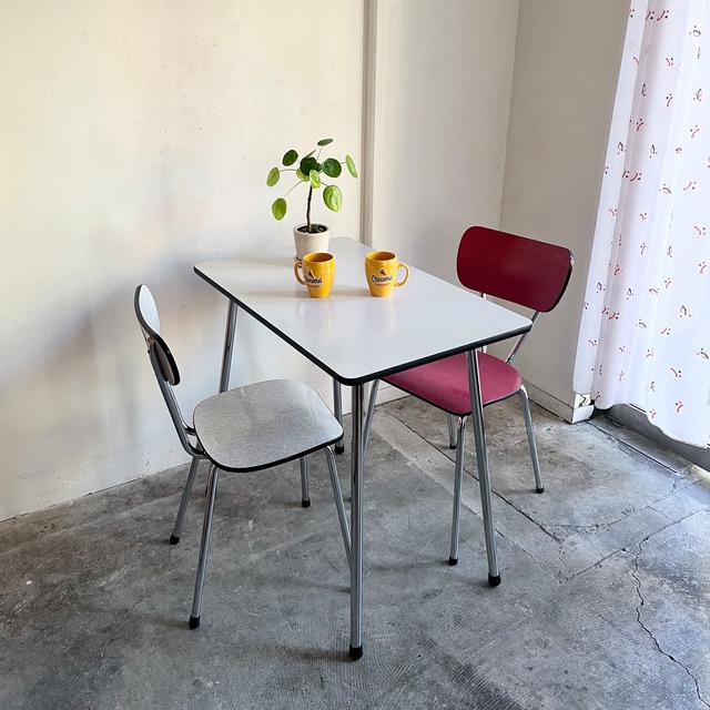 クロームのパイプフレームがモダンな フォーマイカ天板のキッチンテーブル。 1960年代頃からベルギーTAVO社をはじめとして、 フランスやドイツ、オランダ等でも同様のデザインが数多く生産、販売されました。 アパルトマン等の小さなキッチンでの使用を想定しているため 圧迫感を感じさせないミニマルな佇まい。 先細りの華奢な脚先、コンパクトなサイズ感で圧迫感がなく 構造もシンプルでしっかりとしています。 天板表面は水も弾く丈夫なメラミン素材で、 レトロな花柄パターンにより全体が柔らかい印象です。 ダイニングテーブルとしてはもちろん、デスクや作業台として 幅広い用途におすすめです。 ※表示価格はテーブルのみのお値段です。 Condition / 1960-70年代ごろのヴィンテージ品になります。 天板には経年使用による線キズや擦れ、部分的な打痕、補修跡等ございます。 メタルフレームには経年のキズや部分的な錆等ございます。 詳細は画像をご確認ください。 商品の撮影環境の影響やご覧頂くモニター環境などで、画面の色が実際の色と異なっている場合がございます。詳細なコンディションはお気軽にお問い合わせください。 Country / オランダ Size(㎜) / W:995 D:595 H:745 Detail / フォーマイカ天板(メラミン素材) クロームパイプフレーム 脚部取り外し可能 Delivery / 別途送料が掛かります。 東京より、家財おまかせ便 Cランクで発送致します。 (脚部はそのままの状態でのお届けとなります。取り外して発送ご希望の方は、配送料が変わるためご購入前にお気軽にご相談ください。) Attention / サイズの大きな商品の場合、必ずご購入前に搬入経路をご確認下さい。 【 ご購入前に必ずお読みください 】 お支払い後の変更やキャンセルは承れませんので、 下記ご希望の方はご購入前にメール・お電話にてご相談下さい。 自社配送をご希望の方 / 東京都内近郊に限り、自社配送を承っております。 お届け先までの配送料、お支払い方法等ご案内いたしますので、メール・お電話にてお問い合わせください。 店頭ピックアップ(送料なし)をご希望の方 / 送料が設定されるシステムのため、別のお支払い方法をご案内いたします。 お気軽にご相談ください。 他商品と合わせてご購入・複数ご購入希望の方 / 商品一点ごとに送料がかかるシステムとなっています。 宅急便の場合送料が変わりますので、メールにて別途お見積もり、お支払い方法をご案内いたします。 家財おまかせ便の場合、商品ごとに送料がかかりますので変更はございません。 その他不明な点などございましたら お気軽にお問い合わせください。 お問合わせ先 : [email protected] まで 営業時間 12:00-19:00 (金曜定休 / 木曜予約制) 木曜は予約制となっております。 前日19:00までに電話またはメールにてご予約ください。
