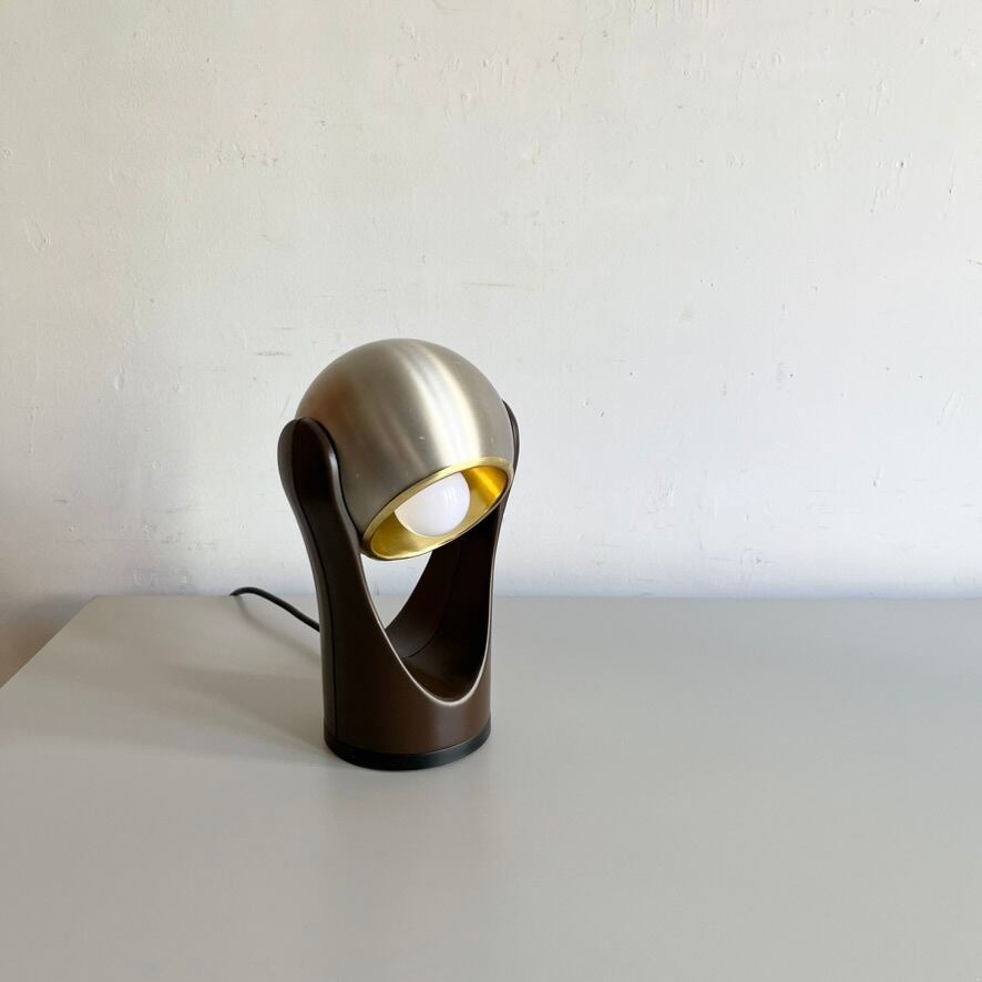 ブラウンのプラスチックベースにメタリックなボール型シェードがアクセントとなっており、シェード部分をタッチすることで点灯・消灯が可能です。