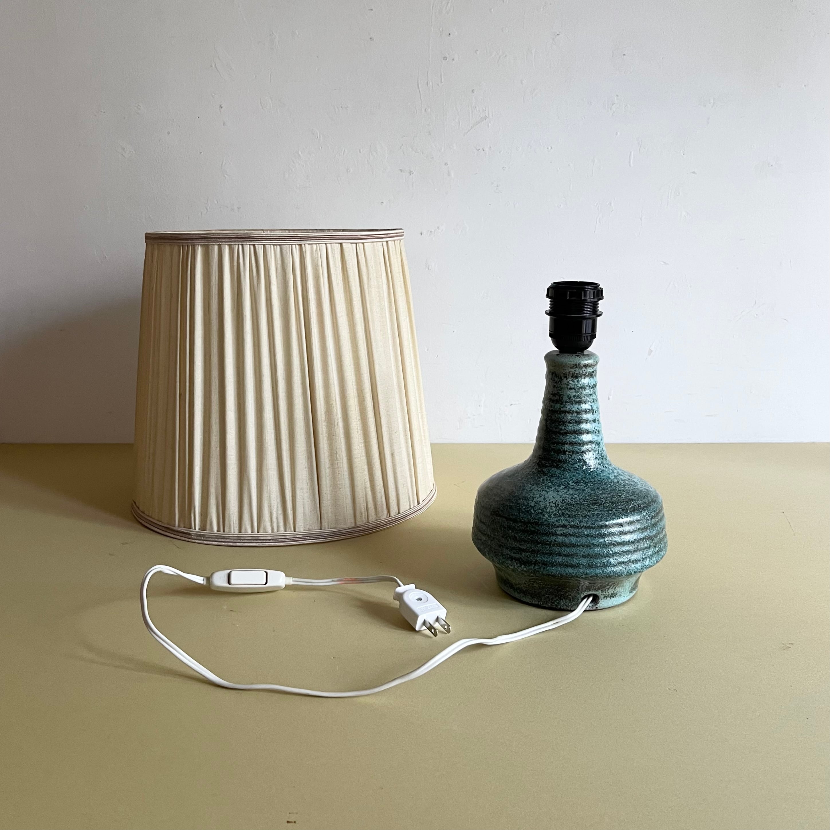 艶のあるミントグリーンの陶器ベースに雰囲気のあるファブリックシェード。