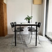 シンプルな構成のメタルフレームは圧迫感を与えず、端に配されたレッグによりチェアを2脚並べても余裕を持って使用できる設計。実用性と美しさを兼ね備えたデザインです。