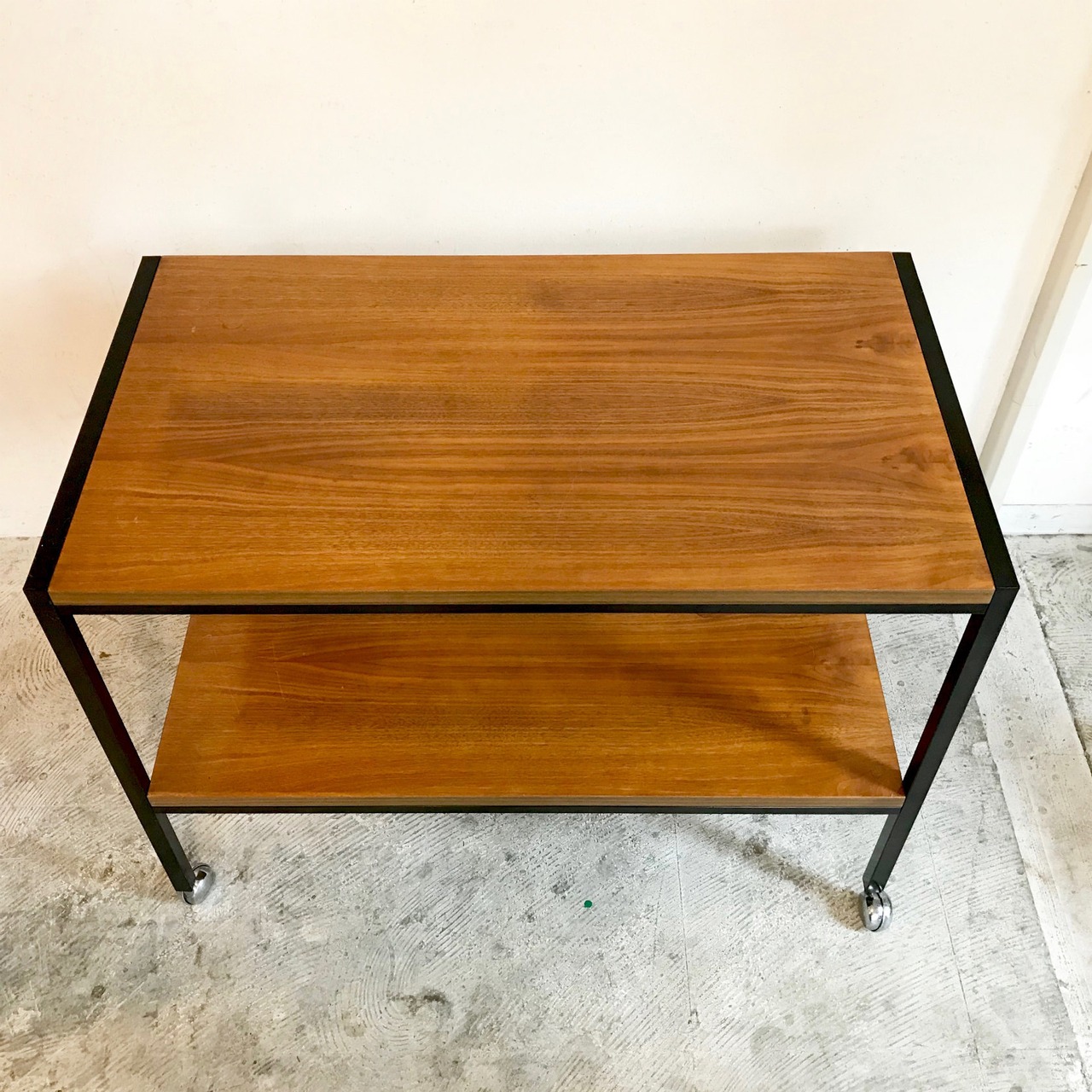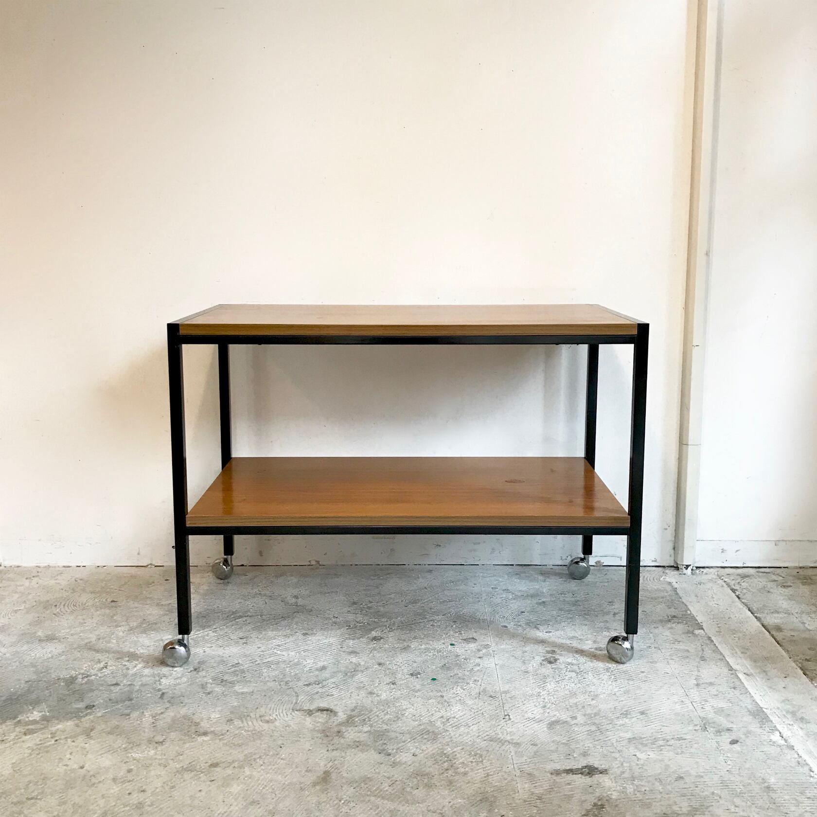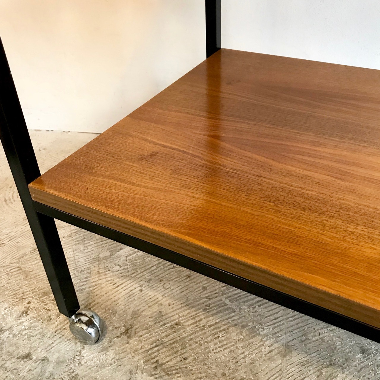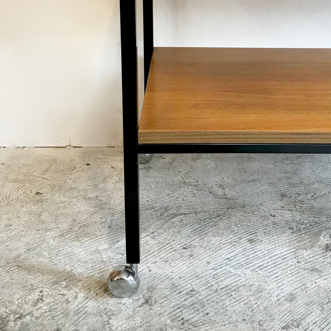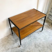 アイアンフレーム、チーク材の棚板、クロームキャスター