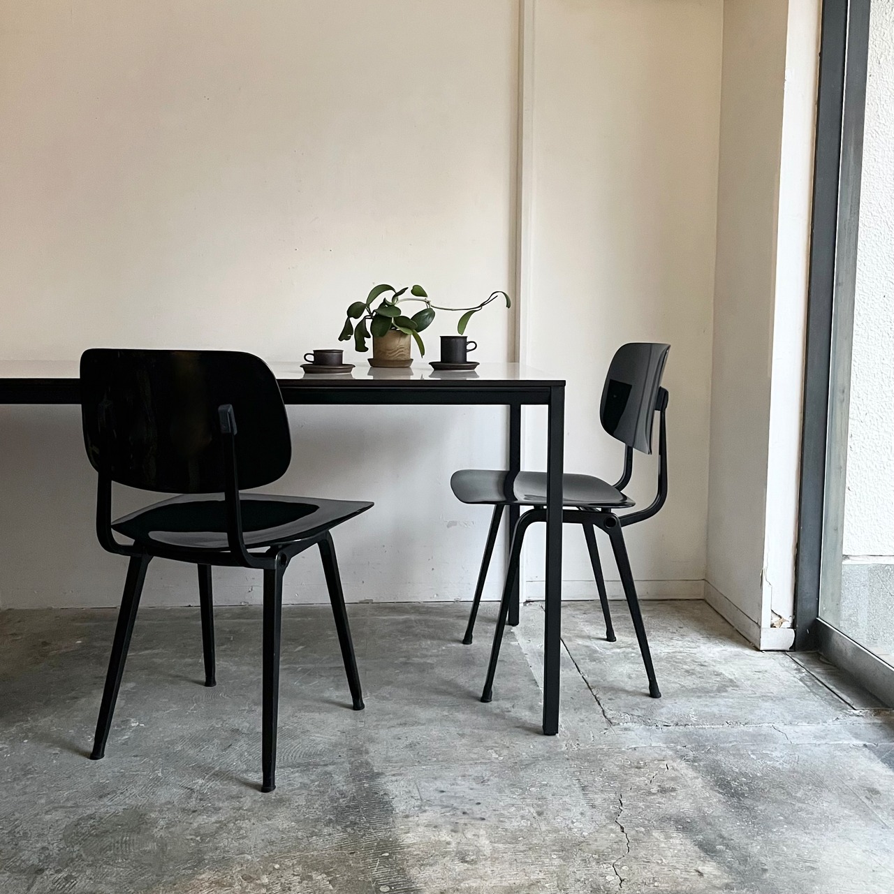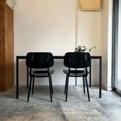 直線的でミニマルなデザインは空間に圧迫感を与えず、脚部を端に配することでチェアを並べてもゆとりのある設計。