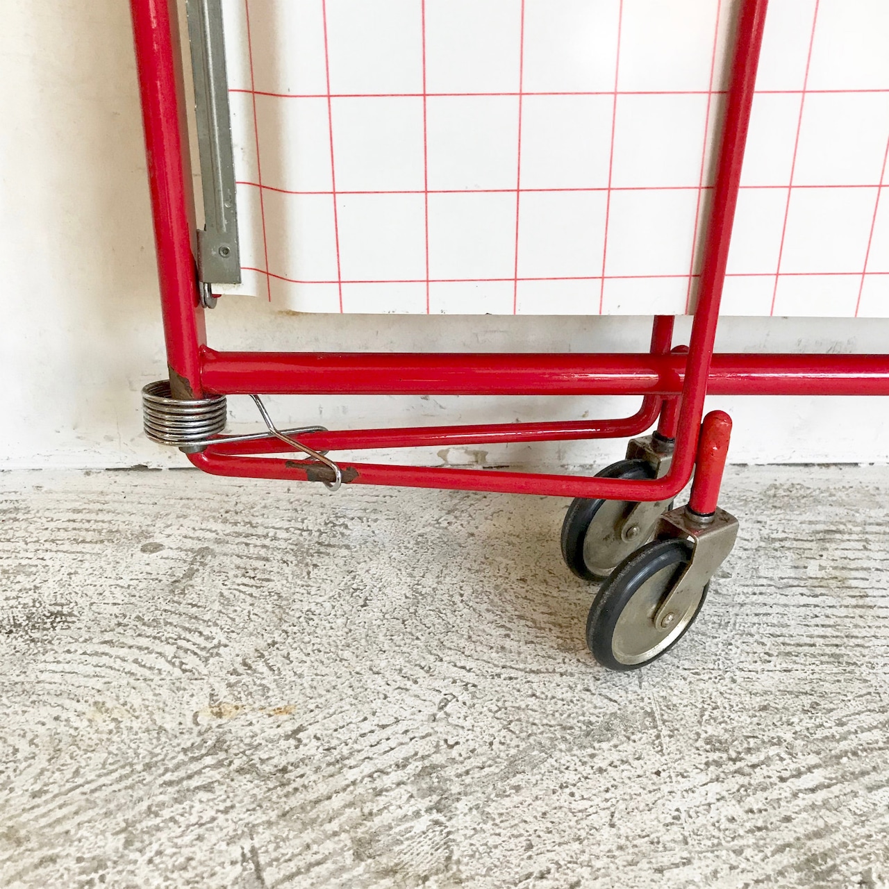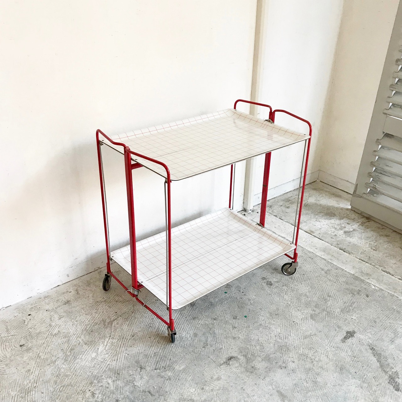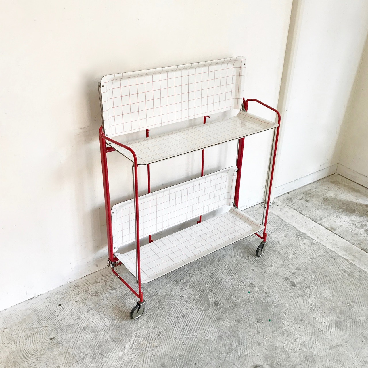 赤い塗装のメタルフレーム、白地に赤いグラフチェックのメラミントレイ、キャスター付き