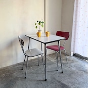 レトロな柄のファーマイカシートは丈夫で汚れにくく、軽量で移動もらくらく。