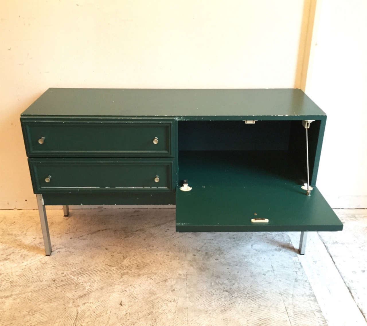 深いグリーンにペイントされ、経年で良い雰囲気が出ているサイドボードです。