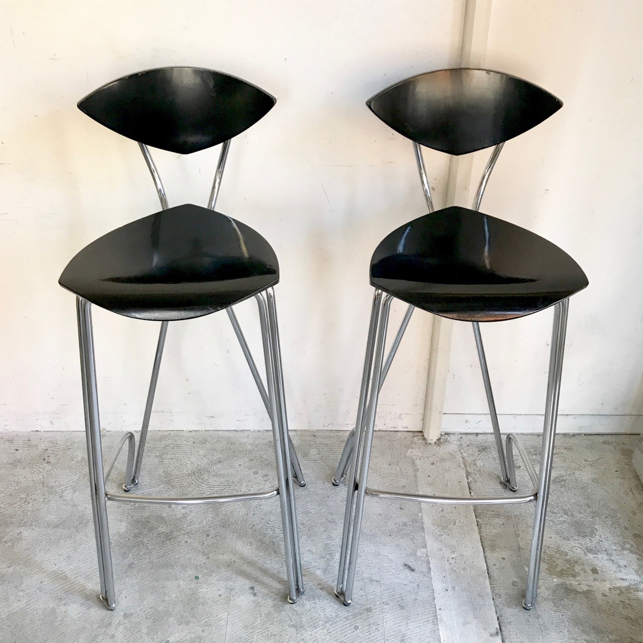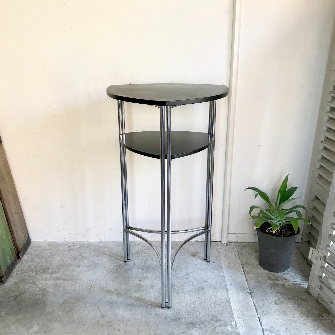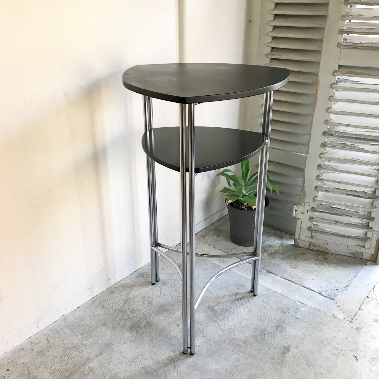 三角形の天板から伸びるクロームフレーム、ブラックシートのコントラスト