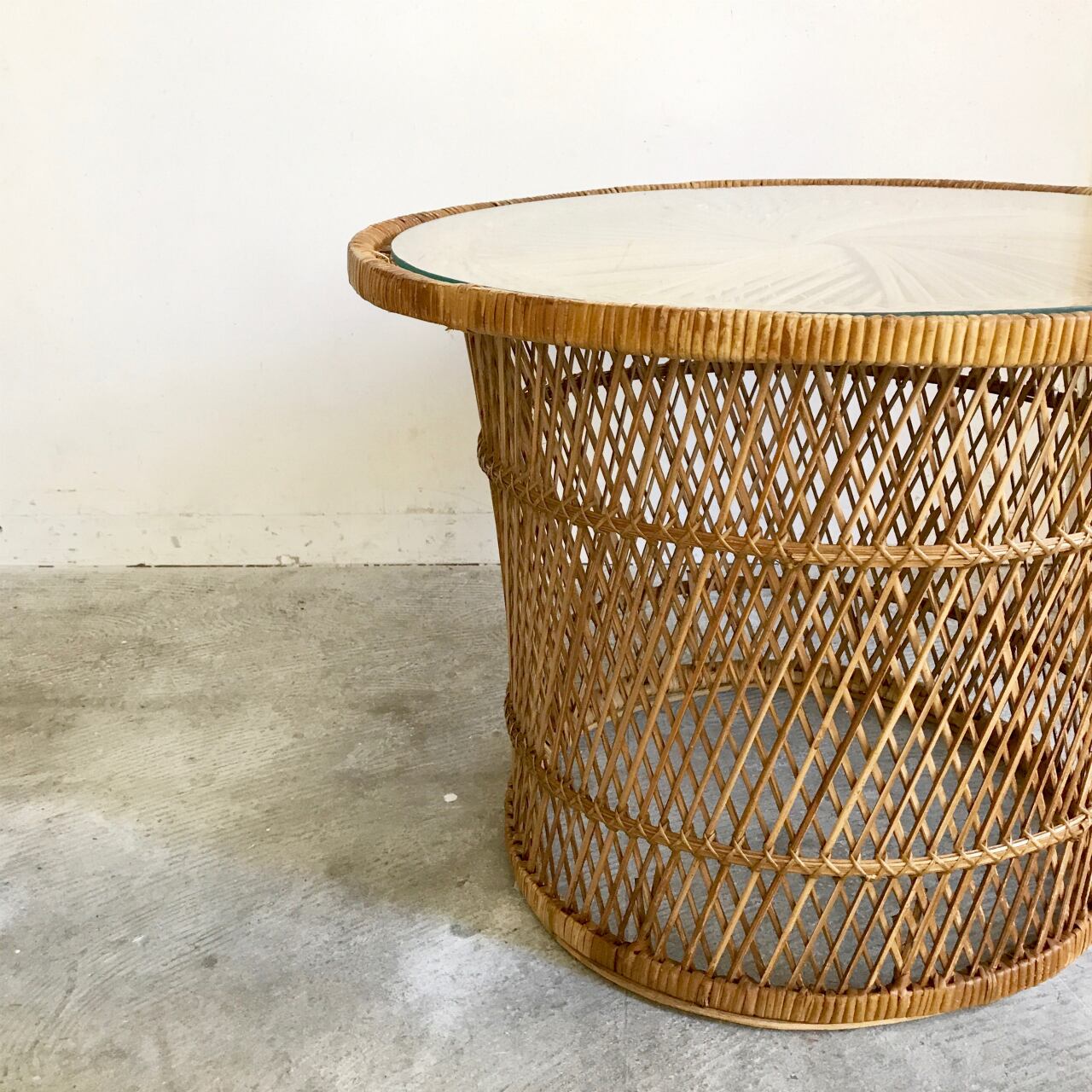 ★自社配送/店頭ピックアップ限定商品★ 70's Vintage Glass Top Rattan Round Side Table