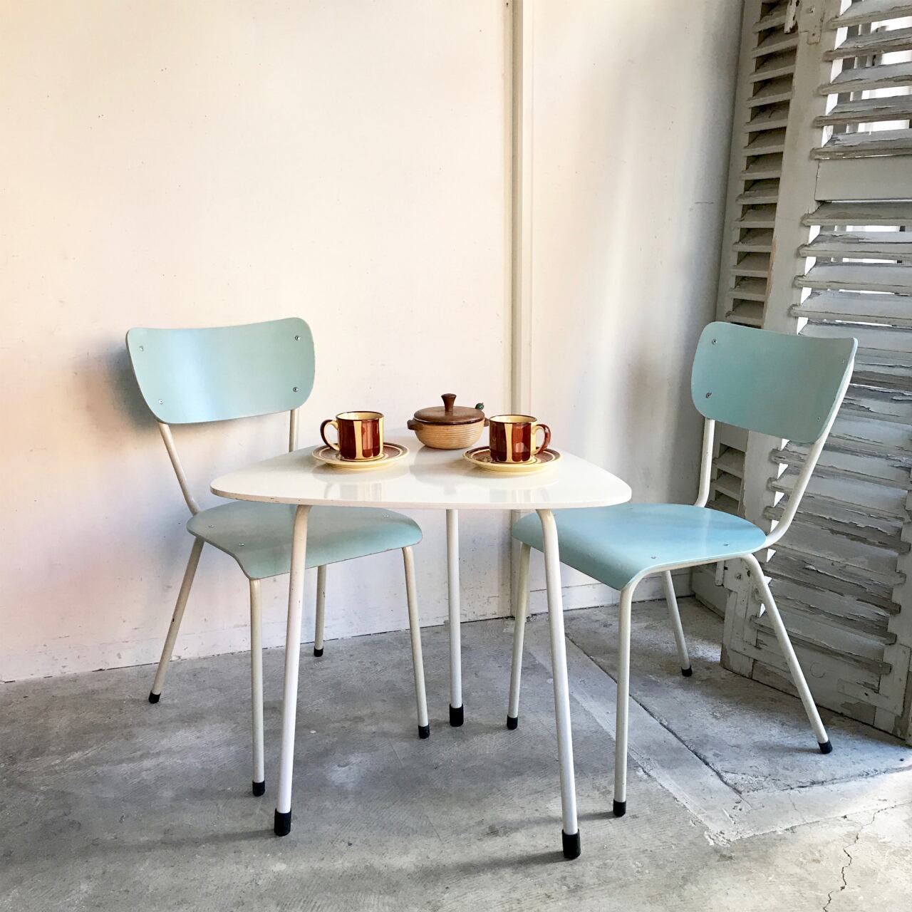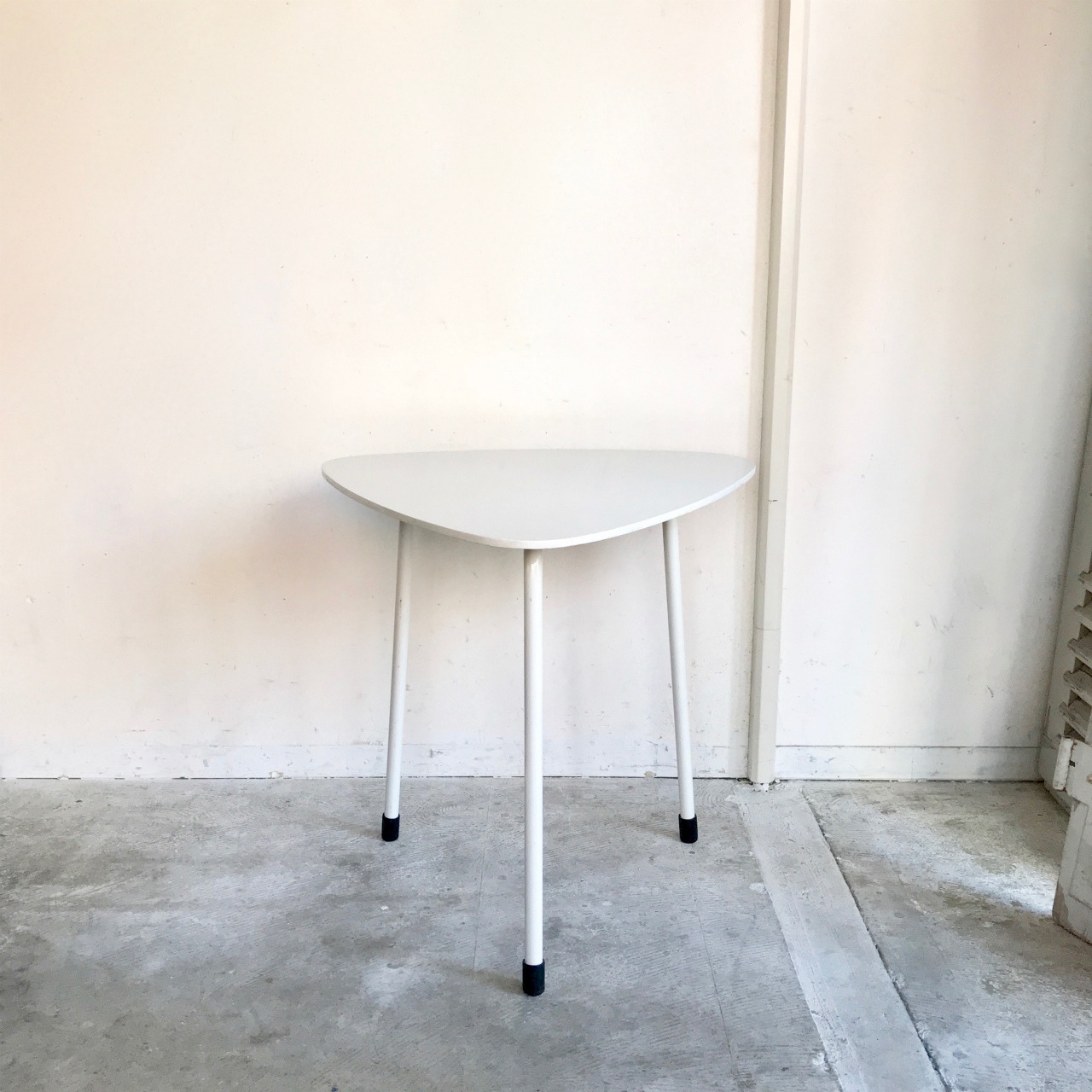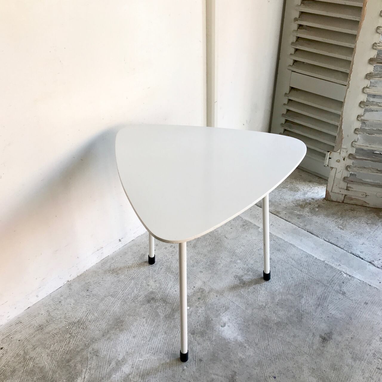 印象的な三角形の天板からまっすぐ伸びるパイプ脚。