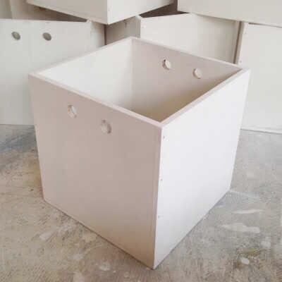 マットWHTにペイントされたプライウッド製キューブボックスです。
