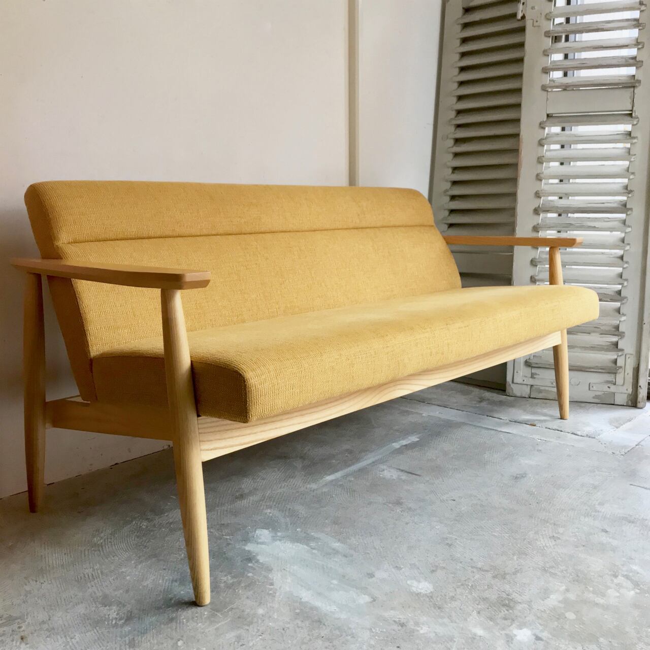 明るめのファブリック、ナチュラルな色目のオーク材。