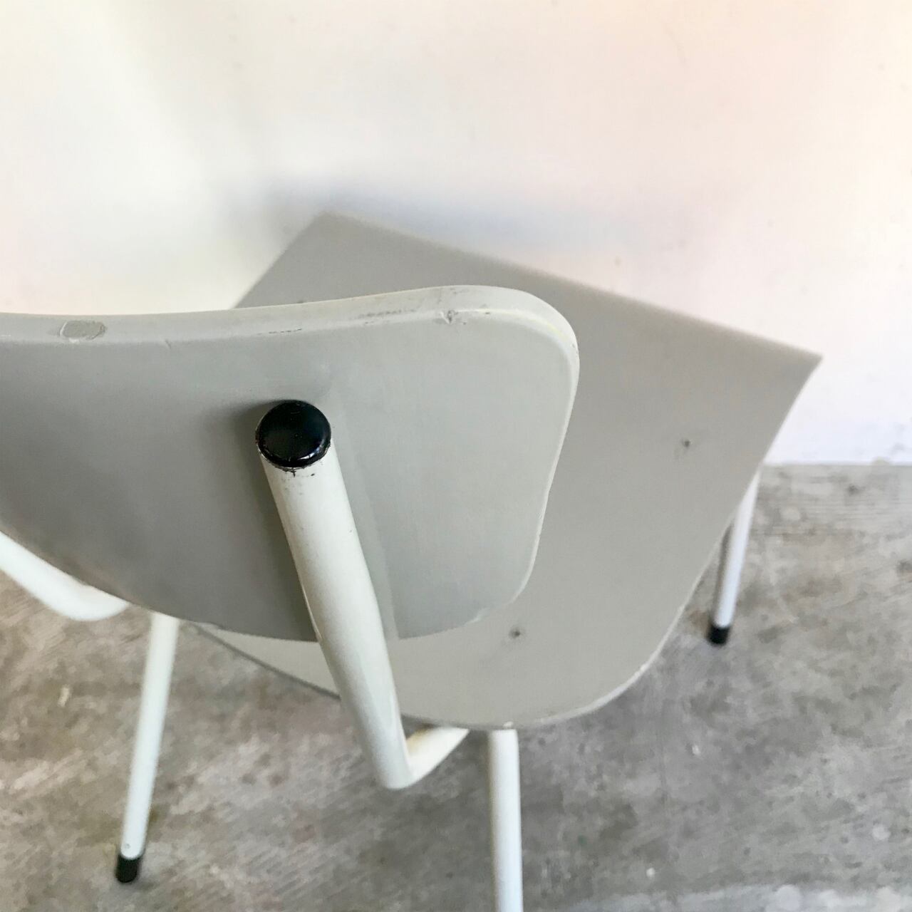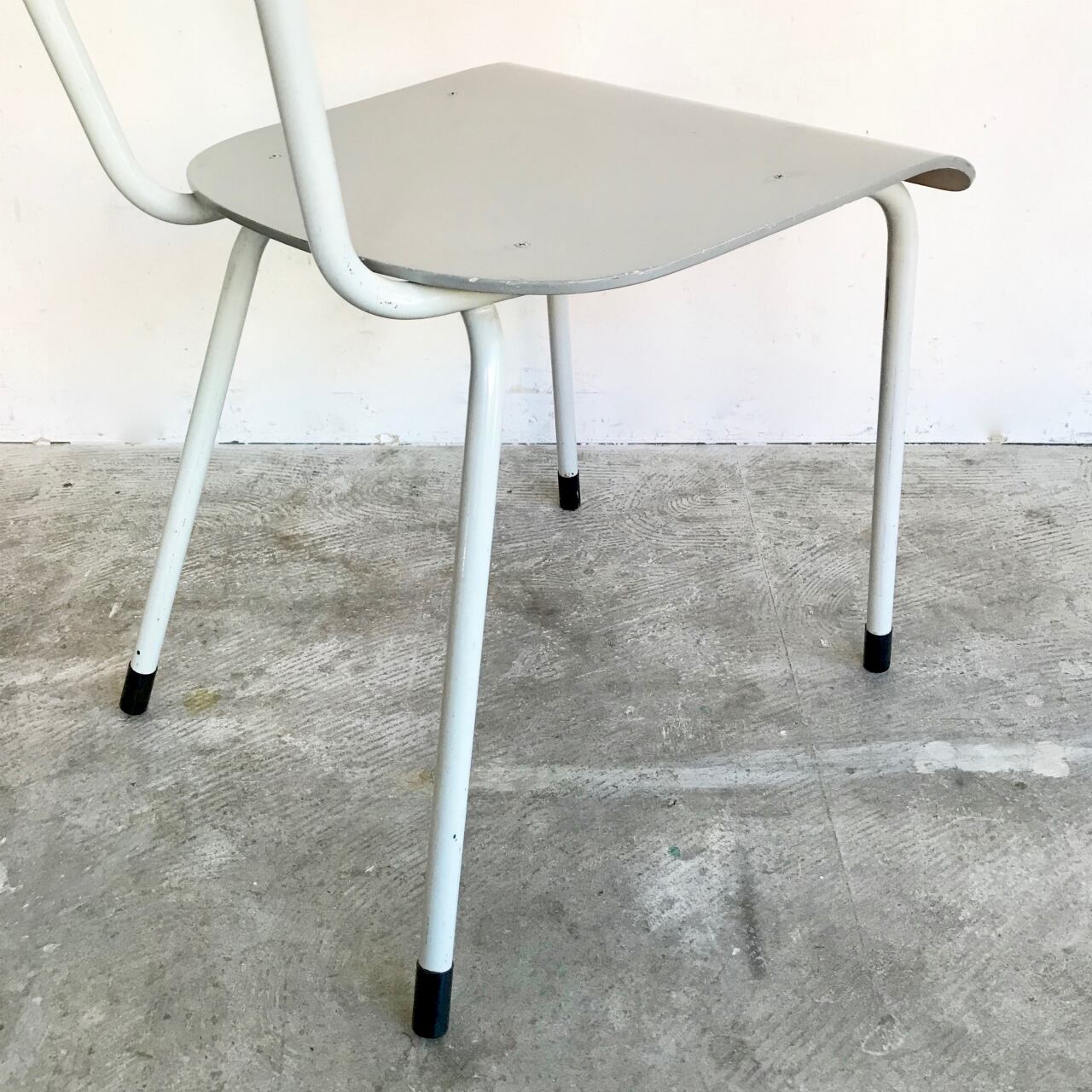 モダンななグレーのシート、背もたれからまっすぐ伸びるパイプレッグ。