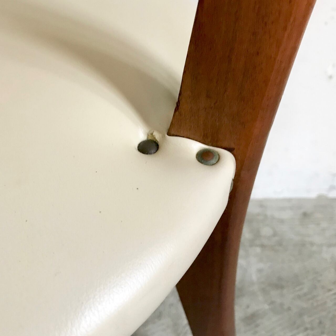 チーク材フレームには経年使用による小さな打痕やコバの欠け、部分的な染みや色抜け等ございます。