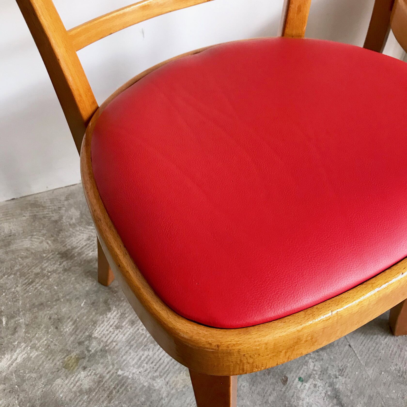 古い曲げ木のフレームにポップなシートのコントラストは