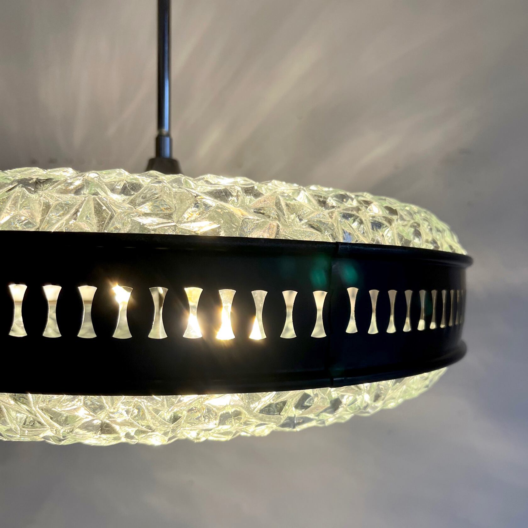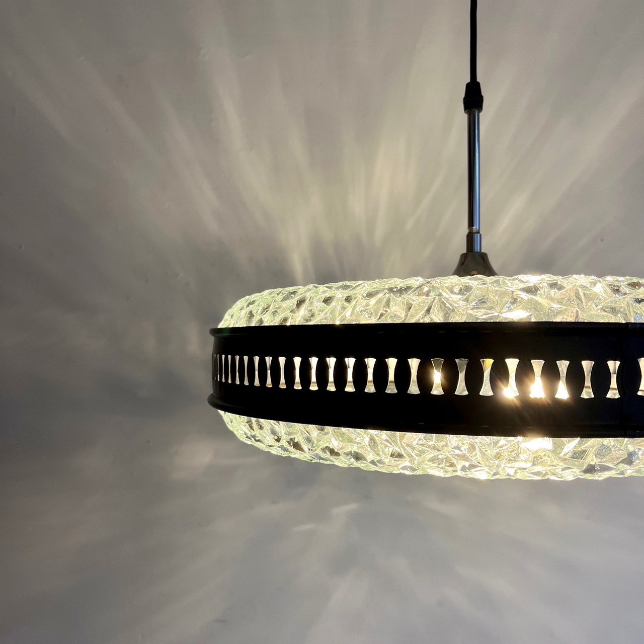Space Ageを感じる大きめの円盤型ガラスシェードが宙に浮いたようなデザイン。