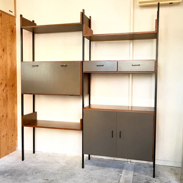 メタルポールにチーク材のユニットが三つ、(レコードキャビネット、観音開きキャビネット、引き出し2杯)と