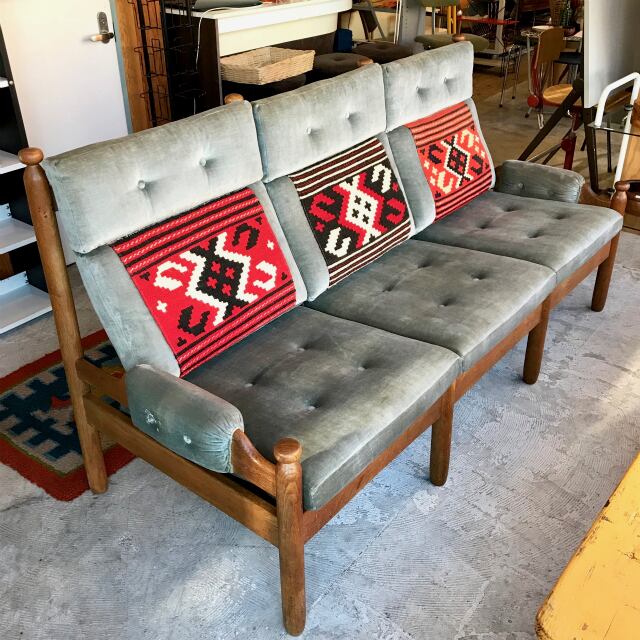 可愛らしい3色のラグがあしらわれた、3人掛けソファが入荷しました。