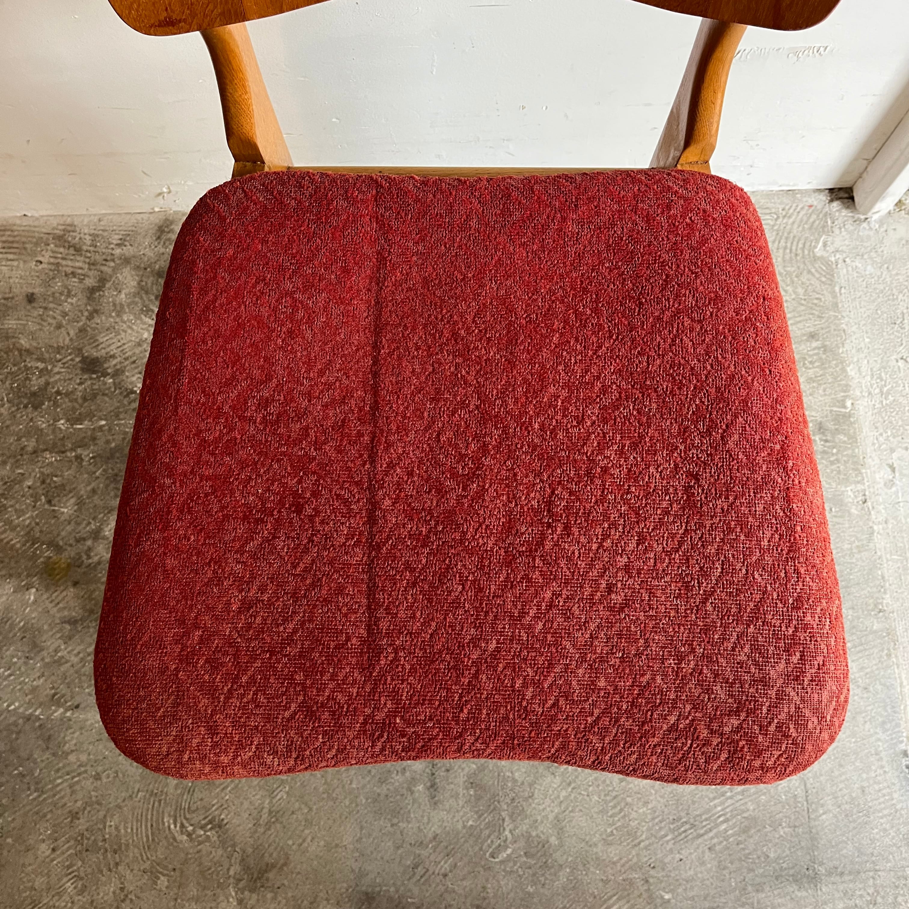 明るめのオーク材のフレームをベースに赤いファブリックのシート。